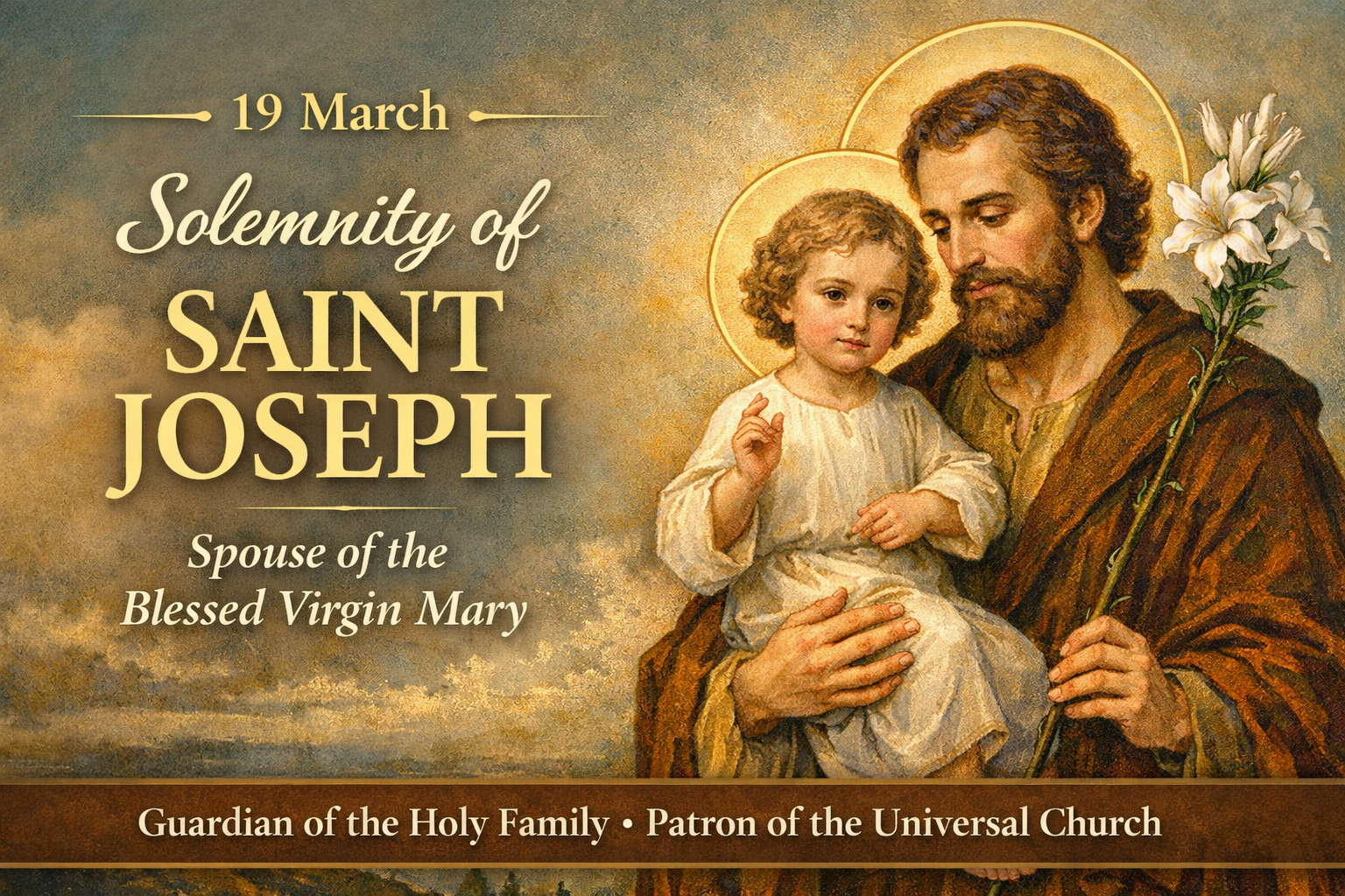 On 19 March the Catholic Church celebrates the Solemnity of Saint Joseph, the Spouse of the Blessed Virgin Mary, one of the most important feasts in the liturgical calendar. It honours the humble carpenter of Nazareth whom God chose to be the earthly guardian of Jesus and the faithful husband of Mary. The Church venerates him as Patron of the Universal Church, protector of families, and a model of faithful obedience to God’s will.